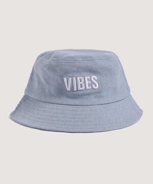 - Sombrero bucket en denim para mujer, bordado vibes, costuras a tono, textura acanalada.