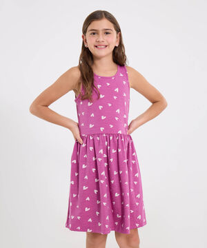 - Vestido sin mangas para niña con estampado de corazones sobre fondo fucsia.