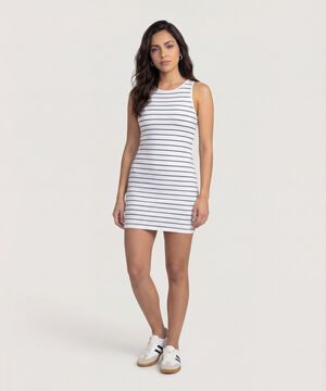 - Vestido corto para mujer, cuello redondo, manga sisa, silueta ajustada, textura lisa, hombros descubiertos.Un diseño cómodo y ligero que puedes usar para un look versátil en climas cálidos.Hecho en poliéster, algodón y elastano.